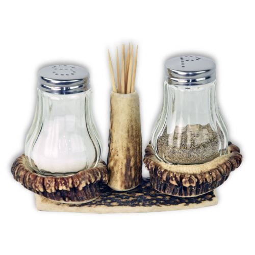 Suur soola-pipra komplekt ehtsast hirve sarvestikust — muljetavaldav lauakaunistus jahimehe kodus.