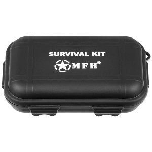 MFH waterproof survival kit 5-in-1 is a compact emergency kit with the most essential tools. Waterproof case protects contents from moisture. Includes fire-starting equipment, fishing gear and emergency tools.
