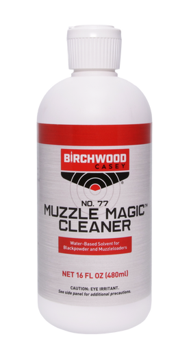 Birchwood Casey Muzzle MagicĀ® No. 77 is a traditional, water-soluble cleaner for muzzleloaders and black powder firearms. Prevents rust and loss of accuracy from blackpowder fouling. Effectively dissolves powder residue and loosens any metal traces for easy removal. After cleaning, apply BarricadeĀ® Rust Protection to all metal parts. Flip-top cap for no-spill cleaning.