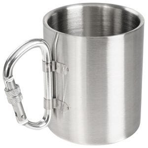 Fox Outdoor stainless steel thermos mug 300ml with carabiner is a convenient drinking vessel for active use. Carabiner allows attaching to backpack. Double-wall construction keeps drinks at temperature longer.